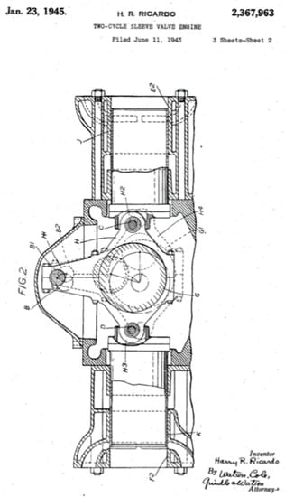 - Ricardo, H. Two Stroke Sleeve Valve Engine. U.S. Patent No. 2,367,963, 11 June 1943. [Google Scholar]