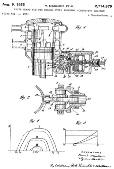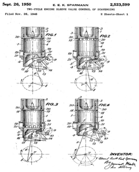 E.E.K. Sparmann 26 November 1946, two-cycle engine sleeve valve control of scavenging US 2523599. Reproduced with permission from US Patent Office. Copyright Publisher, 1950.