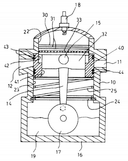 - Chen, Y.; Chen, C. Two Stroke Engine. U.S. Patent No. 6662764B2, 6 November 2003. [Google Scholar]