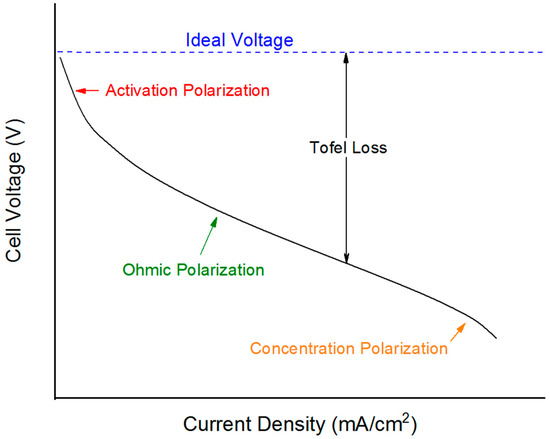 One must note that voltage loss can result from cell polarization, leading to a loss in potential and the inability of cells to operate at the ideal voltage. Cell polarization can occur in three ways: activation polarization, Ohmic polarization, or concentration polarization [34]. The polarization of PEMFC shown in Figure 1.