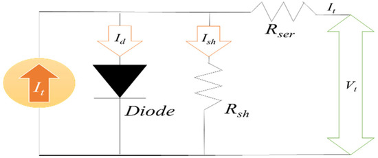 As shown in Figure 2, the SD PV cell model has a current source that is connected in a parallel with a diode [13,35]. Under light, an actual PV cell exhibits series and shunt resistance. The terminal current (It) for the PV cell in the model can be expressed as follows: