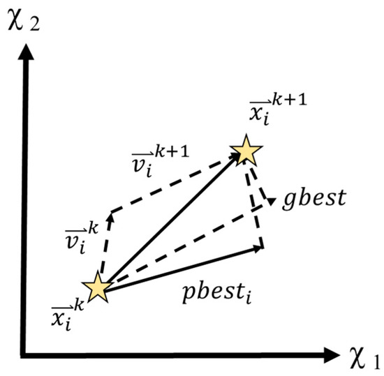 As compared to other swarm intelligence algorithms, PSO stands out as one that is not only highly efficient, but also does not require much memory space in its calculation. The algorithm, which is based on birds’ foraging behaviors, adjusts the speed of particles to alter their positions and conducts multiple searches to identify their optimal positions [36]. These equations are expressed in Equations (21) and (22), and Figure 3 depicts a schematic diagram of the particle search. A basic PSO search uses the optimal positions identified through an individual particle’s and combined particle swarm’s current search results to determine the direction of the subsequent search target, in order to quickly attain a convergent solution: