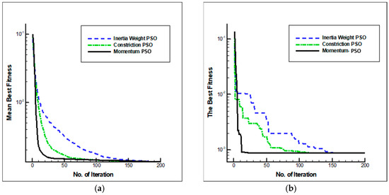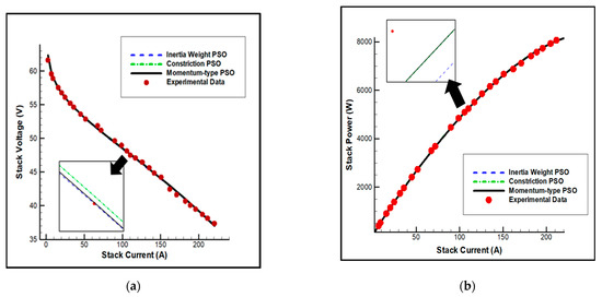 The number of particles for the three improved PSO algorithms was set as 50, and the number of iterations per run was set as 200. In total, 30 independent runs were conducted to analyze the robustness of the algorithms. The PEMFC model calculation results obtained were compared with calculation results from other studies. Figure 4a illustrates the I–V characteristic curve analysis results of the three algorithms used in the PEMFC model, which indicate that the experiment results were considerably consistent with the calculated results of the three algorithms. Figure 4b depicts the Power–V characteristic curve analysis results of the three algorithms, which show a clear increase in the output power following a rise in the stack current, and that the experiment results were also considerably consistent with calculated results of the algorithms. Convergent solutions are divided into two types, namely, Mean Best Solution and Best Solution. Figure 5a,b present a comparison of the algorithms regarding their convergence ability, in which it can be seen that momentum PSO significantly outperforms inertia weight PSO and constriction PSO.