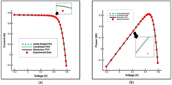 Table 3 and Table 4 present a comparison of the experimental and calculated values of the terminal current, which reveals consistency between the experimental values and the calculated values using the three improved PSO algorithms. The optimized parameter values calculated using the momentum PSO algorithm, which demonstrated the most efficient calculation of the three algorithms, were further compared with values acquired from other studies. Table 4 lists the optimal parameter solutions and Sum of Squares for Error (SSE) values acquired using the momentum PSO algorithm and algorithms from [37,38]. The SSE value of the momentum PSO algorithm was 2.0656, lower than that of the algorithms from [34,39,40]—this demonstrates that the momentum PSO algorithm exhibited the most satisfactory SSE value out of all the listed algorithms.