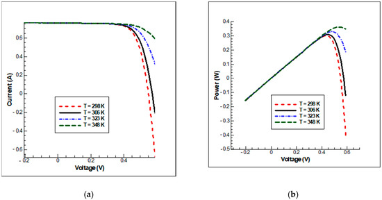 The effect of the temperature of a PV cell on its I–V and Power–V characteristic curves was further analyzed. For comparison, the PV cell temperature was set to 25 °C, 33 °C (used in the experiment), 50 °C, and 75 °C. The optimal parameters acquired using the momentum PSO algorithm were used for calculation. As shown in Figure 8a, when the cell temperature increased, the net current increased significantly after the terminal voltage on the I–V curve exceeded 0.4 V. Similarly, as depicted in Figure 8b, when the cell temperature increased, both the net power and maximum net power increased significantly after the net voltage on the Power–V curve exceeded 0.44 V.