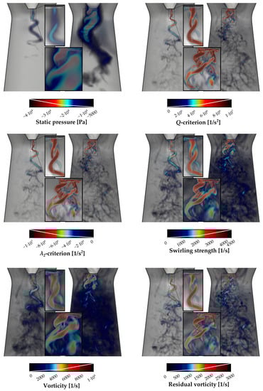 The -criterion by definition gives no information about the intensity of the swirling motion. For this reason, we suggest combining with the residual vorticity. From the computational domain, we select only those data points (particles) that satisfy the -criterion. These points are then colored according to the residual vorticity and rendered by volume rendering (Figure 4). At first, one needs to choose appropriate integration time. For each case, we present a longitudinal slice of an area under the hub tip with the vortex rope, colored by , for three different integration times T. Generally, as T grows, more particles get into the hyperbolic zone, leading to the decay of their value. For the case with the lower swirl number, we observe that particles starting from the vortex rope core remain in the elliptic zone for long times, while particles starting from its surroundings spend considerable portion of time in the hyperbolic zone. There is a sharp gradient of values that clearly highlights the vortex core edge. For the case with the higher swirl number, the situation is more complicated, as there are many smaller vortices concentrated in the spiraling structure. Together with shorter time scales, this increases the uncertainty of the results. The volume renderings with the threshold of contain the vortex rope in the first case, but miss many structures with a high residual vorticity, especially the twin spiraling vortices under the hub tip, in the second case. A lower threshold of is fulfilled by substantially more particles in the second case, leading to much more structures visible in the volume rendering. In the first case, the change is less significant.
