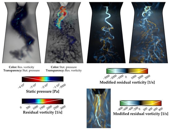 Figure 3 shows that, for the higher swirl number, the static pressure highlights the whole region of spiraling motion, whereas other criteria highlight small vortices. This led us to the idea of combining them using volume rendering, similarly as isosurfaces of a given quantity are often colored by another quantity. Two possibilities are depicted in Figure 5. If the transparency is set according to the static pressure and colors according to the residual vorticity, we see the spiraling region mostly in black, indicating low values of the residual vorticity. Of the vortices with a high residual vorticity, only those in the front are visible. The advantage resides in the fact that the vortices are better distinguishable in this representation than in the volume rendering of the static pressure field in Figure 3. If the transparency is set according to the residual vorticity and colors according to the static pressure, we get information about the pressure in smaller vortices. Generally, combining two quantities in one representation this way can elucidate their mutual relation.