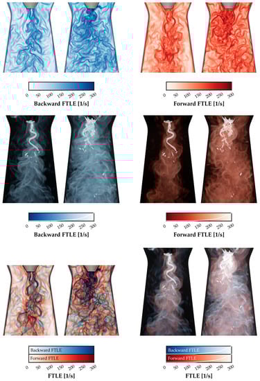 The finite-time Lyapunov exponent (FTLE) is an objective (independent of reference frame) Lagrangian quantity connected with Lagrangian coherent structures (see Reference [29] for a comprehensive review). Its applications comprise, e.g., studies of general turbulence [37], flow over an airfoil [38], motion of animals [39,40], and oceanic eddies [41]. The FTLE is a measure of separation of neighboring particles in time, i.e., the local maximizing curves (ridges) of the FTLE field may indicate either locally maximal stretching or locally maximal shear [37]. When integrating forward in time, high values of FTLE signalize repelling structures. Similarly, backward integration leads to attracting structures. Details on the procedure can be found in Reference [42]. Consider a function that for each initial position of a particle, initial time and final time t returns the position of the particle in the final time t. This so-called flow map can be written as