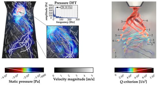 Visualization of swirling flow within the diffuser was carried out for 2 snapshots, which correspond to instantaneous flow fields characterized by and . The total flow rate (and hence also the Reynolds number) was held constant (5 L/s).