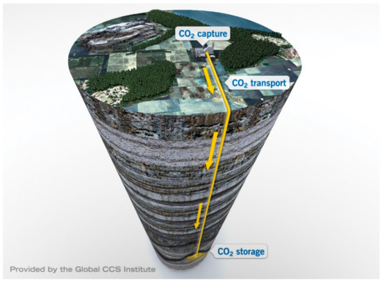 CCS is a technology for reducing emissions from large-scale industrial point sources of CO2. These sources comprise all types of industry, including fossil fuel and biomass power and heat generation, synthesis of petrochemical products, and production of cement, iron and steel [24]. During the process of CCS, CO2 emissions are captured before entering the atmosphere, compressed into a liquid-like state, transported and injected deep into subsurface geological formations for permanent storage. In this way, it is possible to avoid billions of tonnes (Gt) of CO2 from entering the atmosphere and to securely and permanently (e.g., on the order of thousands of years) store the CO2 in the deep subsurface (Figure 1) [24].