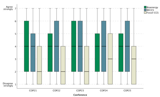 Figure 2 shows the views of the general population randomly surveyed at different areas within the COP from COPs 21–25. This assessment is designed to give information on the general overall opinions of CCS over time. For all surveys, the responses span the entire range from strongly agree to strongly disagree. The Bonferroni-corrected Kruskal-Wallis test detects only small statistically significant differences in views of bioenergy (without CCS) compared to views on BECCS. These technologies both have medians of 4 over all COPs meaning “neither agree nor disagree” and lower quartiles of 2, which signal a consistent middle-of the road viewpoint. The upper quartile for BECCS, however, shows a statistically significant increase from about 5 to 6, indicating slightly more positive views of BECCS from COP 23 onwards. In contrast, the upper quartile for bioenergy is variable and could be seen to decrease from 6 to 5. Thus, it could be surmised that the increase in the popularity of BECCS in this case is due to an increased acceptance of CCS despite slightly lower opinions of bioenergy.