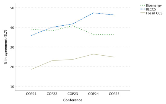 To further illustrate these conclusions, we include a line chart (Figure 3) of the percentage of all respondents that have marked “agree slightly” to “strongly agree” that investments should target BECCS or fossil CCS, (i.e., all respondents that have answered 5, 6 or 7). This is perhaps a more visual representation of how views have become more positive over time, although at a very low level overall for fossil CCS. We include the data for bioenergy to shed light on whether any change in views on BECCS are more likely related to CCS or to other issues around bioenergy as a whole. As previously stated, objections to bioenergy are usually related to biomass availability and potential conflicts with biodiversity and food security [23]. However, it is also possible that objections to BECCS could originate from a lack of faith in CCS technology. For example, Anderson and Peters [36] state “The idea behind BECCS is to combine bio-energy production with CCS, but both face major and perhaps insurmountable obstacles”. The data indicate that the increased acceptance of BECCS is most likely the result of an increase in acceptance in CCS overall rather than an increase in the acceptance of the use of bioenergy for fuel. This is because we see bioenergy acceptance decrease as BECCS acceptance increases. Alternatively, it is possible that these trends reflect the opinion that NETs are of such great importance, that bioenergy would only be acceptable as a fuel when coupled with CCS to deliver the greatly needed NETs. In this scenario we could surmise that attitudes on CCS may be increasing with an increasing awareness of the need for long-term NETs.