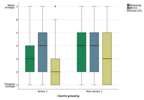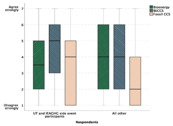 The inclusion of bioenergy, BECCS, and fossil energy with CCS within the questionnaires presents a unique research opportunity to assess an additional layer of information on attitudes about CCS. As previously discussed, we see attitudes against CCS because of its association with fossil fuels. What are attitudes about CCS when it is coupled with bioenergy, i.e., BECCS, which is a NET? With information supplied on both bioenergy and BECCS, any decoupling of attitudes between these two mitigation options could indicate whether attitudes about BECCS are due to the CCS component or the biomass component. According to [23], objections regarding the biomass component can include a range of issues including biomass availability, conflicts with biodiversity and food security goals, or competition for land. Thus, comparing the answers from each respondent could tell us if the biomass or the CCS component is the reason for the attitude.