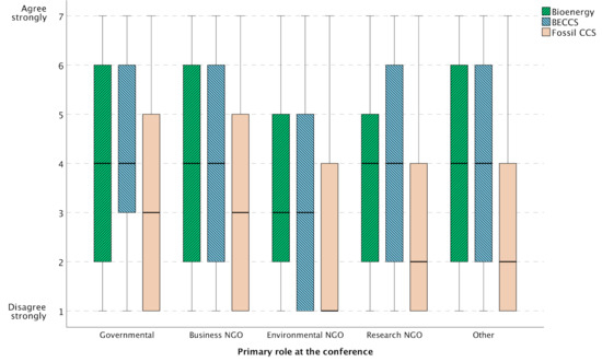 The results show that across the board, environmental NGOs view all of the listed mitigation technologies as less desirable than other groups view them. For BECCS, statistically significant differences can be detected between researcher, governmental and business groups, which have the most positive views, and environmental NGOs, which have the least positive views. This trend is very similar for bioenergy with medians that consistently match BECCS in all groups. Looking at upper and lower quartiles of bioenergy versus those of BECCS, CCS appears to slightly improve the case for bioenergy for governmental and research NGOs whereas it generally decreases the opinions of environmental NGOs regarding bioenergy. Other respondents seem to be indifferent to the CCS component. Environmental NGOs are the only ones that break with this bioenergy trend, seeing bioenergy with CCS as slightly less positive than bioenergy alone.
