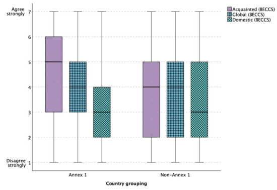 The results suggest that A1 country delegates feel more educated on BECCS (median = 5) than NA1 country delegates (median = 4). A1 country delegates believe that there is a greater need for BECCS in other countries (median = 4) rather than their own (median = 3). In contrast, NA1 country delegates appear to feel a lesser technical readiness and greater need for information and have a greater belief that BECCS should receive investment both globally and in their own countries. With respect to views on BECCS being likely to contribute to the global 2 °C goal, we see no statistically significant difference between A1 and NA1 countries. These results support the notion that there is both a larger need and a greater appetite for information on BECCS in developing countries than in developed, but that a need still exists in both types of countries. Note that this question was not surveyed for the other discussed technologies.
