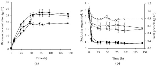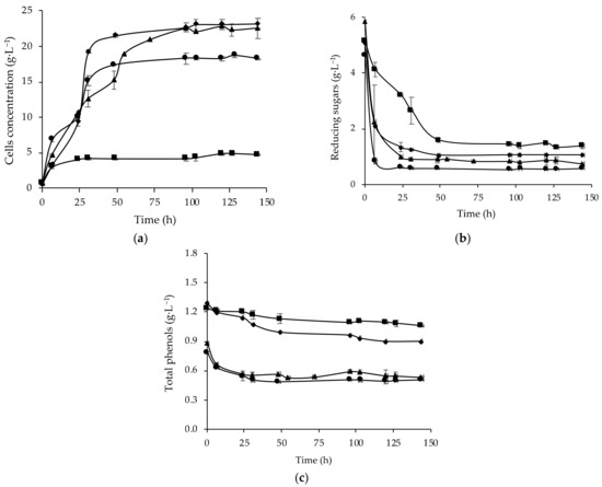 Figure 4a) compared to those at pH 5.5. In both conditions, a stationary growth phase was reached after approximately 50 h of cultivation. As observed in Erlenmeyer flask experiments, also at a bioreactor scale, the consumption of sugars and phenolic compounds occurred in the first 24 and 48 h, respectively, remaining almost constant at the end of the experiments (