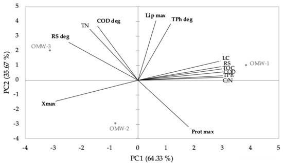 Figure 3, demonstrating that this PCA did not group any OMW, and showing that each OMW has different influences on the studied parameters. In fact, OMW-1 was clearly characterized as a wastewater with a high content of reducing sugars, TOC, COD, and total phenols and low content of total nitrogen. On the contrary, OMW-3 was highly correlated with a high content of total nitrogen and low content of reducing sugars, TOC, COD, and total phenols.