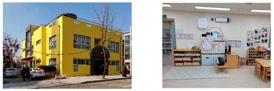 The view of the childcare center (left) and inside the childcare room with the multiple monitoring sensor installed (right).