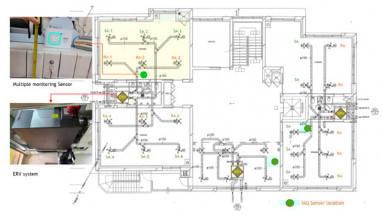 The 2nd floor plan of the childcare center along with the energy recovery ventilation (ERV) systems and the multiple monitoring sensors (the height of sensors is about 1.36 m above the floor).