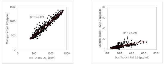 Measured CO2 and PM2.5 concentrations compared to the data from the TESTO 480 (CO2) and the DustTrack II 8532 (PM2.5) sensors, respectively.