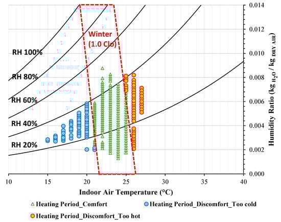 For the childcare center, we found that the indoor air temperature ranged from 15 to 27 °C and the absolute humidity ratio from 0.0013 to 0.0088 kg H2O/kg Dry Air during the heating period, as shown in Figure 5. In addition, we observed that 77.5% and 22.5% of the measured data met and did not meet the winter thermal comfort zone, respectively, during the heating period. Among the 22.5% discomfort data, the too cold data marked by the blue circles accounted for 17.3% and the too hot data marked by the orange circles accounted for 5.2%.