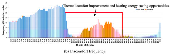 Figure 6b also shows that there were opportunities to improve thermal comfort and save floor heating energy use during occupied hours from 9:00 a.m. to 6:00 p.m., as shown in the red box. We observed that the too cold discomfort times in the 10 min intervals were significantly reduced after 9:00 a.m. because the heating system was turned on. However, high discomfort frequencies still occurred until 9:30 am. If the heating system is turned on at 8:30 a.m. or earlier, the comfort level will be enhanced even though more heating energy use is required. We also observed that too hot discomfort frequencies occurred from 11:30 a.m. to 5:30 p.m. Thus, the radiant floor heating system could be turned on one or two hours earlier than usual in the morning and sometimes turned off to prevent overheating and save heating energy use during occupied hours.