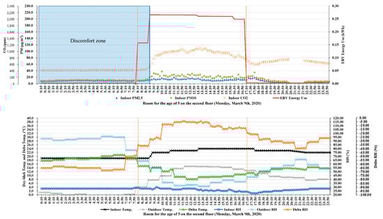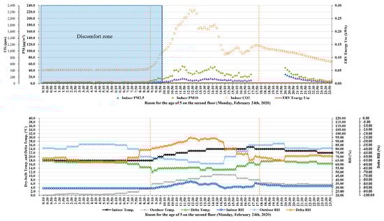 Figure 7 shows the day when the ERV system was turned off (24 February 2020). Due to the lack of operation hours of the ERV system, the CO2 concentrations were over the 1000 ppm required by the Korean IAQ Control Act for childcare/daycare centers. The highest CO2 concentration was 2257 ppm at 12:20 p.m. The lowest CO2 concentration was 895 ppm at 3:10 p.m. after the peak time during the occupied hours. However, high CO2 levels over 1000 ppm were recorded by 7:50 p.m. On that day, the ERV system should be turned on at least by 6:00 p.m. because the average departure time of all the occupants in the room was 6:00 p.m. In addition, based on the CO2 concentration pattern, we learned that the teacher and/or the children moved to another room for other activities at 1:00 and 2:30 p.m. The highest PM10 and PM2.5 during the occupied hours were 52.8 and 15.2 μg/m3, both at 11:40 a.m., respectively. However, the PM2.5 concentration was stable below 20.0 μg/m3. The coarse and fine particle levels were acceptable because the Korean IAQ Control Act for childcare/daycare centers sets limits of 75.0 and 35.0 μg/m3 for PM 10 and PM2.5, respectively. The discomfort zone time ended at 10:00 a.m. The indoor air temperature smoothly reached 24 °C at 1:40 p.m., and the highest indoor air temperature was 25 °C from 5:00 to 5:30 p.m. The indoor relative humidity continuously changed. During the occupied hours, the highest relative humidity was 38% at 12:20 p.m.