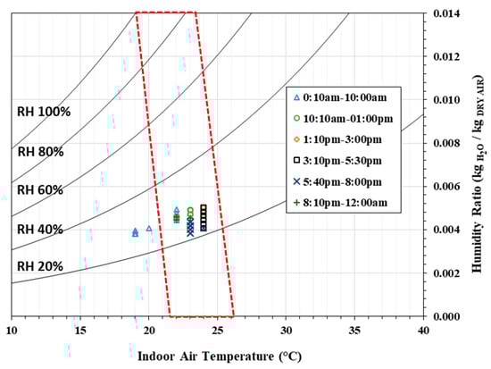 Figure 9 and Figure 10 show an additional graphical comfort zone with time classifications on the ASHRAE psychrometric chart. The 10-min-interval thermal comfort data from the two different days when the ERV system was off and on are visualized using the six-interval classification. When the ERV system was turned on (Figure 10), the parallel variation (i.e., indoor air temperature) on the psychrometric chart and the vertical variation (i.e., humidity ratio), as well as the relative humidity variation, were less than when the ERV system was off (Figure 9). In other words, the clusters of the indoor thermal comfort conditions on the psychrometric chart are more stable. For the time classification from 0:10 to 10:00 am. (i.e., the blue triangles), the indoor thermal comfort condition changes were on a similar relative humidity line between the two different days. After the ERV and heating floor system were turned on at 8:10 a.m., the indoor thermal comfort conditions met the winter comfort zone from 9:10 a.m. For the period from 10:10 a.m. to 01:00 p.m. (i.e., the green dots), the two figures show significantly different indoor thermal comfort conditions. For example, the variation of 0.00186 kg H2O/kg Dry Air between the maximum humidity ratio of 0.00666 kg H2O/kg Dry Air and the minimum humidity ratio of 0.00479 kg H2O/kg Dry Air for the day when the ERV system was off were much larger than the variation of 0.00029 kg H2O/kg Dry Air for the day when the ERV system was on. For the other time periods, the indoor thermal conditions also significantly changed. However, we observed that the changes could be caused by the floor heating system because the indoor air temperature and humidity ratio variations were similar between the two days, even though the locations of the thermal comfort clusters were significantly different.