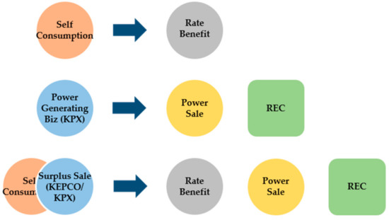 PV is classified into two types: (a) a grid-connected type that is connected to the commercial power grid; and (b) a standalone type that is used by the solar cell alone for a wireless base station [5]. Out of the two types, we focus on the grid-connected type generally used in Korea. It is important to choose adequate the types of solar power transactions since these types could determine the revenue of PV. These types can be largely divided into price offset transactions, links to new and renewable power projects, and installation of self-consumption power generation facilities that directly consume the power generated by the PV system owner. Price offset transactions refer to transactions in which a facility receives power from the power system if it does not have solar power or if it lacks sufficient power. The facility uses electricity produced by solar power and transmits it back to the power system. In this case, the electricity charges are calculated based on the residual amount of electricity. The excess amount is deducted from the amount of electricity for the subsequent month without the need for any cash adjustments. A linkage of new and renewable power generation businesses using solar power can be established, and power can be sold in the electric power market or based on an electricity contract with a retailer. Here, the amount of electricity sold will be settled by the system marginal price (SMP), and the revenue from the renewable energy certificate (REC) sales can also be obtained. The operator of self-consumption power generation facilities can sell the electricity that is used and/or left over by the PV. Currently, those who have installed facilities other than PV can only sell less than 50% of the annual total output of electricity.