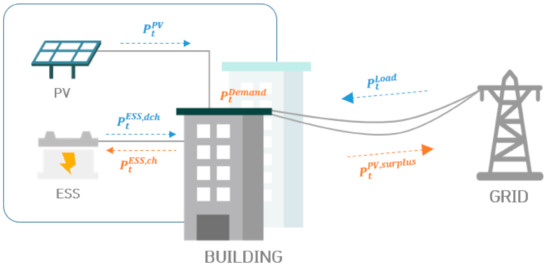 Equation (25) shows that the sum of the total load owing to the use of the building and the power required to charge the ESS is equal to the amount of power supplied to the building, the discharge of the ESS, and the power generation of the PV. The amount of power supplied from the grid to the building has an upper limit.