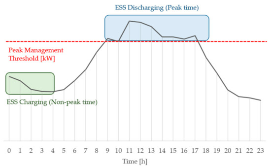 The ESS performs peak and charge reduction operations to reduce electric power charges. A peak shaving operation is an operation that aims to lower the peak used in the base charge calculation by managing the ESS so that it does not exceed the set peak, as shown in Figure 3. By setting the management peak value, the peak power can be managed, and the power charge can be saved. The largest part of the saved electricity cost is attributed to the reduction of the base charge that is settled differentially according to the contracted capacity. Peak management implemented through an ESS can be assisted by PV power generation when the peak time management threshold is during the solar daytime. If the peak management threshold is excessively high, the installation costs will be low, but the cost savings will be underestimated. In contrast, if the peak management threshold is set too low, the burden of the facility installation cost becomes large, and the facility principal cannot be recovered within the operation period of the facility.