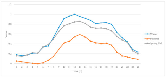 This case study is for a commercial building attached to an apartment-type factory located in Gyeonggi-do, South Korea. The seasonal load of the building is shown in Figure 4, and all seasons show a maximum peak pattern from 12:00 to 13:00. The total annual electricity consumption was 872,000 kWh. Figure 4 shows that the load pattern of the building is concentrated in the daytime and dispersed at night.