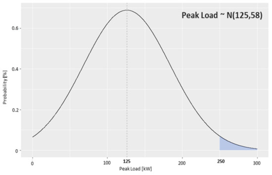 In peak reduction operations, a threshold should be identified wherein a peak load management reference threshold can be efficiently applied to the peak load of the target building. It is possible to manage peaks below the reference threshold without the ESS since the peak exceeding the reference point could be managed through the ESS. If the amount of peak exceeding would be normally distributed as shown in Figure 5, the peak management range would be decided by outside confidence interval. This was calculated based on a value that does not generally occur, and is set to be utilized for base charge reduction through peak management.