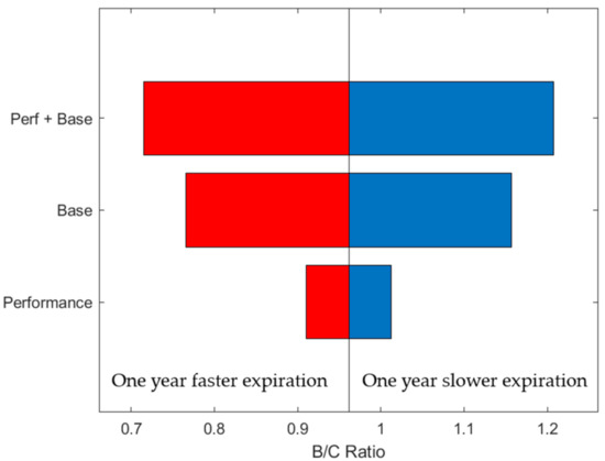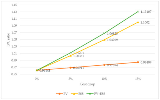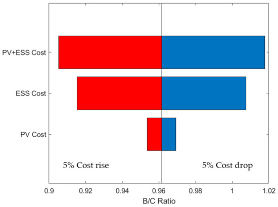 The coefficient for variation of rate applied during the operating period is assumed to be the special rate for a renewable energy system. This value can increase or decrease within the operating period. The benefit period expiration and benefit variables of the special rate for renewable energy is applied as of 2019. The peak and load electricity rates are based on the eighth basic plan for long-term supply and demand [34]. The reduction in the facility efficiency of PV and ESS was established on the basis of long-term operation [35]. The details are shown in Table 6.