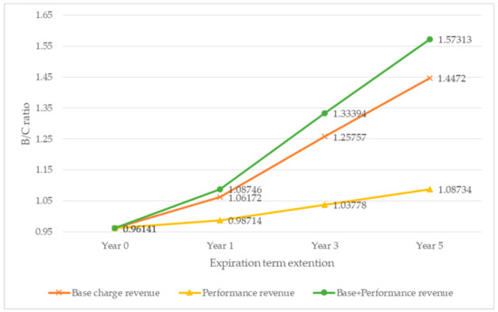 Revenue comprises base charge and performance revenue. This is formatted in Equation (6). The base charge revenues comprise the benefits according to peak reduction and the base charge discounts of the special rate for the renewable energy system, as expressed by Equation (7).