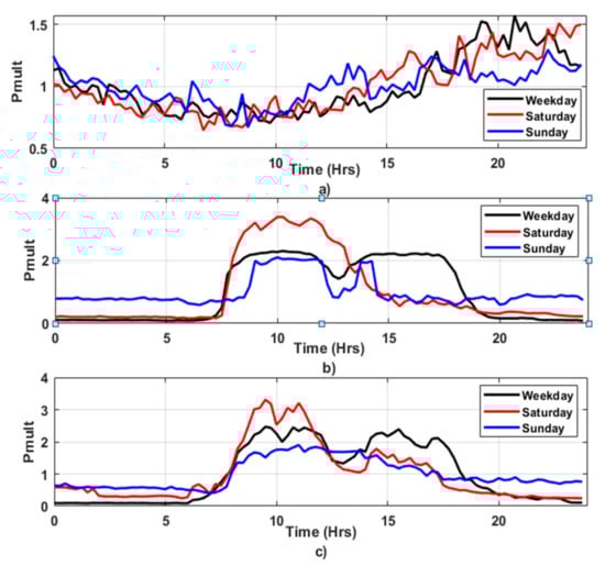 As a result of the used methodology, Figure 1 presents three load curves that describe consumption characteristic of a residential (Figure 1a), commercial (Figure 1b) and industrial (Figure 1c) consumer. In the figure, the vertical axis variable is the multiplier factor of the average load demand for each instant of the load curve. It can be seen that the curves applied to each low or medium voltage load, depending on the tariff group and voltage level, make the distinction, both in form and in billed energy, for the same load on different days of the week.