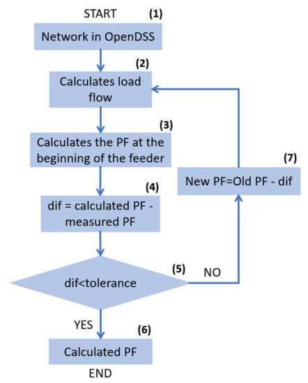 In this sense, an algorithm was implemented to estimate the power factor of low voltage consumers, based on the power factor value measured at the feeder-substation coupling point that is usually measured by the electric utility. Figure 3 presents a flowchart to explain the algorithm: