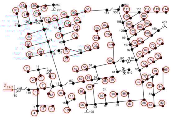 However, taking the definition of the EOI resistive () and reactive () components and , it is concluded that the load current influences both the numerator, and the denominator, once and are given as: and ,. Thus, it is reasonable to expect a cancellation effect due to the load current and, consequently, that and are not very sensitive to loading variations. Therefore, for variable network loading conditions, but maintaining the same network topology and adequate voltage profile for all loading conditions, for example voltage magnitude variation between ±5%, the EOI is expected to have an approximately constant value for all loading conditions [18,19,20,21].