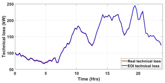Thus, using the total measured injected current and the EOI calculated in Figure 15b, the total technical loss curve can be obtained, as shown in Figure 17. This calculated technical loss comprises losses resulting from supplying regular and irregular loads as well as other sources of non-technical losses that may have occurred in the electrical network under analysis.