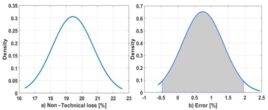 (a) Gaussian distribution of percentages of non-technical loss added to the base system; (b) Gaussian distribution of errors obtained between the real technical loss and the loss calculated by the EOI methodology.