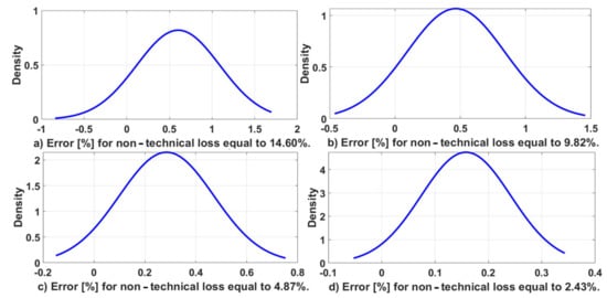 In order to evaluate more scenarios on the percentual values of non-technical loss to be added randomly to the billed load, these percentual values were varied in the ranges of 0–30%, 0–20%, 0–10% and 0–5%. Thus, the average total non-technical losses, considering these scenarios and after one hundred simulations were equal to 14.76%, 9.76%, 4.87% and 2.44%, respectively. Therefore, for these scenarios, the errors Gaussian curves obtained are shown in Figure 12a–d respectively, for average non-technical losses equal to 14.76%, 9.76%, 4.87% and 2.44%, which resulted in percentual errors equal to 0.6366%, 0.5004%, 0.2863% and 0.1486% respectively for applying the EOI methodology.