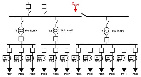 The real system used in the simulation studies was the Pedreira substation, in the urban area of Belém city in the state of Pará, Brazil, which belongs to the Equatorial Pará, the local distribution utility. This substation has three 20 MVA, 69 kV/13.8 kV transformers supplying 12 distribution feeders, as shown in Figure 13.