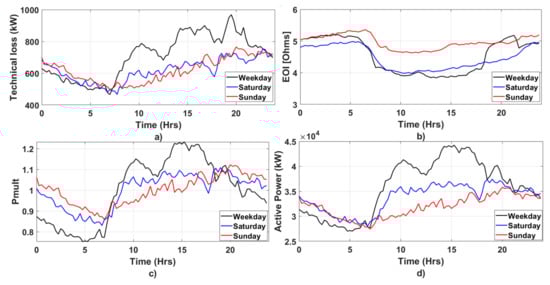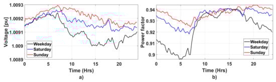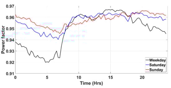 Therefore, to perform the loss calculation according to the proposed methodology in Figure 5, the adjusted power factor values as presented in Table 5 are used. To illustrate the power factor correction algorithm applied to a daily load cycle, it is presented in Figure 14 the results obtained for PD01 Feeder’s loads for weekday, Saturday and Sunday load curve profiles considering only billed demands.