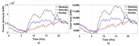 After calculating total technical losses, the methodology is continued to calculate the non-technical losses. For this, the data of monthly energy consumed by each consumer unit are extracted and arranged as demand curves for a weekday, a Saturday and a Sunday, in step 13, as shown in Figure 18a. Then, in step 14, the total loss is calculated by subtracting total injected power curves and power demand curves, shown in Figure 18b.