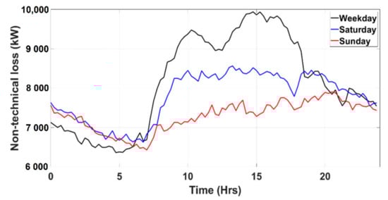 Non-technical losses for weekday (black), Saturday (red) and Sunday (blue).