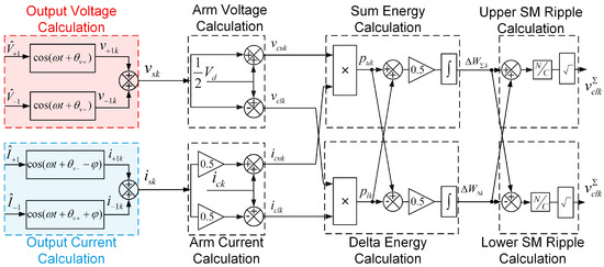 The proposed equations are an extension of the analytical method presented in [20]. In order to introduce the proposed analytical method in an easy and clear way, the block diagram (Figure 2) presents the capacitor voltage ripple derivation steps. In this paragraph, the basic process of derivation is briefly introduced. First, the unbalanced grid voltages and currents are detected and calculated for the next step. The positive-/negative-sequence forms of voltage/current components are applied in this paper. Second, based on the grid voltages and currents, the arm voltages and currents are calculated by the arm voltage/current definitions. Third, the arm power can be calculated by the arm voltages/currents; then, the arm energy (the calculation will be easier by dividing arm energy by sum energy and delta energy) can be derived by integrating the arm power. Finally, the submodule-capacitor voltage ripple can be derived by the relationship between the capacitor energy and capacitance. For the moment, the three-phase capacitor voltage ripples have been separately derived. In order to understand the relationship between phases A, B, and C, the symmetrical component method is used to identify the positive-/negative-/zero-sequence ripple components. In this way, the three-phase ripple can be seen as a whole system, not as three separate phases. The detailed derivation is given in the following.