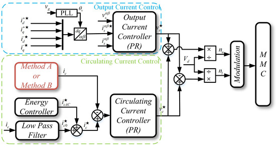 Before showing the simulation and experimental results of the proposed method, the structure of the MMC controller is introduced below. The structure of the MMC controller is presented in Figure 7. Two variables of the MMC need to be controlled: the circulating current and the output current. Therefore, two independent controllers are needed: the circulating-current controller, which is responsible for making sure that all the undesired AC components are properly suppressed, and the output-current controller, which is responsible for tracking the desired reference. In this paper, the AC circulating-current components are injected according to Method A and Method B. The circulating-current control is able to properly track the AC components, since it is based on a proportional resonance (PR) controller. An energy controller is also part of the circulating-current control, which is necessary for making sure that the MMC’s upper and lower arms have equal voltage values.