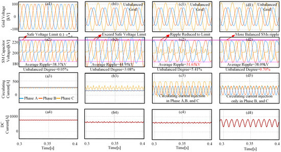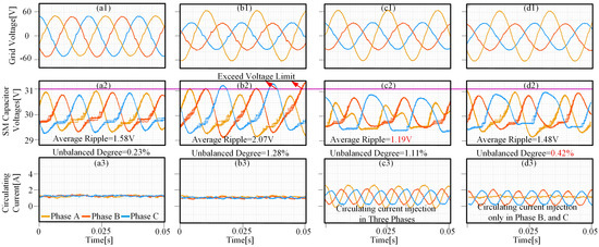 In Figure 8(a1–a3) the grid voltages, capacitor voltages, and circulating currents under a balanced grid are shown, respectively. By observing Figure 8(a1), one can notice that the grid voltage is, in fact, a three-phase symmetrical signal with an amplitude equal to 100 kV. Thus, as shown in Figure 8(a2), the submodule-capacitor voltages are also symmetrical, and all the capacitor voltages are within the safe limits (10% of the submodule-capacitor voltage’s nominal value, which is equal to 220 kV). The undesired AC components of the circulating currents are suppressed, and thus, the circulating current is purely DC. Detailed numbers are shown in Table 2.