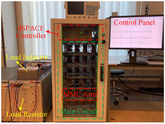 To evaluate the performance of the proposed ripple-reduction methods, experimental results are presented in this section. The experiment was carried out in a low-scale three-phase grid-connected MMC test setup with four half-bridge SMs per arm. The parameters of the experimental setup are shown in Table 1. The control was implemented using a dSPACE DS1006 board. The experimental setup worked as a three-phase MMC inverter. The level-shifted-carrier modulation method was applied with the sort and select algorithm. The switching frequency was equal to 2 kHz in this experiment. Figure 9 shows the experimental setup of the MMC.