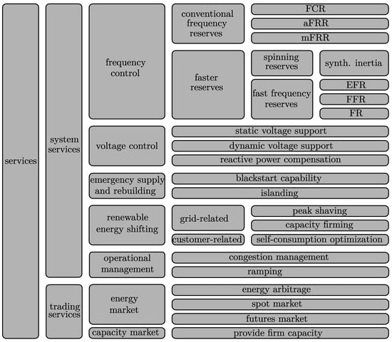 In order to reduce the greenhouse gas emissions, the European Union has defined the “Clean energy for all Europeans package”, which describes the corresponding measures up to 2030. These goals comprise an increase of the share of renewable energy by 32%, a reduction of the greenhouse gas emissions by 55% and an increase of energy efficiency by % by 2030, in each case compared to 1990. IRENA assumes the majority of renewable energy to be variable renewable energy such as wind power- and solar photovoltaic generation, which will represent 50% share of renewable energy in the power sector in 2030 [1]. This massive amount of variable renewable energy leads to increasing power fluctuations, which require additional flexibilities in the future power system. One way to provide such flexibilities are storage systems. Long- and short-term storage technologies therefore are expected to be increasingly integrated in the power system [2]. Battery Energy Storage Systems (BESS) are expected to cover a part of the short-term storage demand for durations between minutes, hours or days, especially due to their unique capability to quickly absorb, hold and then reinject electricity. IRENA estimates BESS to grow from a storage capacity of 11 GWh in 2017 to 100 GWh–412 GWh in 2030, which is expected to be evenly divided between front-of-the-meter (utility-scale) BESS and behind-the-meter BESS [3]. According to Hesse et al. [4], behind-the-meter BESS require a connection at the grid level of the meter and are typically integrated in the low-voltage- or medium-voltage grid, whereas utility-scale BESS typically are of larger size and integrated in the medium- or high-voltage grid. There are several services which are using the flexibility of a BESS and contribute to coping with power fluctuations in the future. Besides the prevention of curtailment of variable renewable energy, for example, by performing “peak-shaving”, which may aim to cache the energy surplus in times of high stress of the grid and release it in times of low stress of the grid, other services such as frequency control or voltage support are the main services currently provided by BESS [3]. Due to the moderate feed-in tariff for photovoltaic systems, the self-consumption optimization today is the most frequently used service for behind-the-meter BESS, which also contributes to destress the grid and to prevent curtailment. Based on the services identified in several studies [2,3,4,5,6], Figure 1 presents an overview of possible services BESS are suitable to provide.